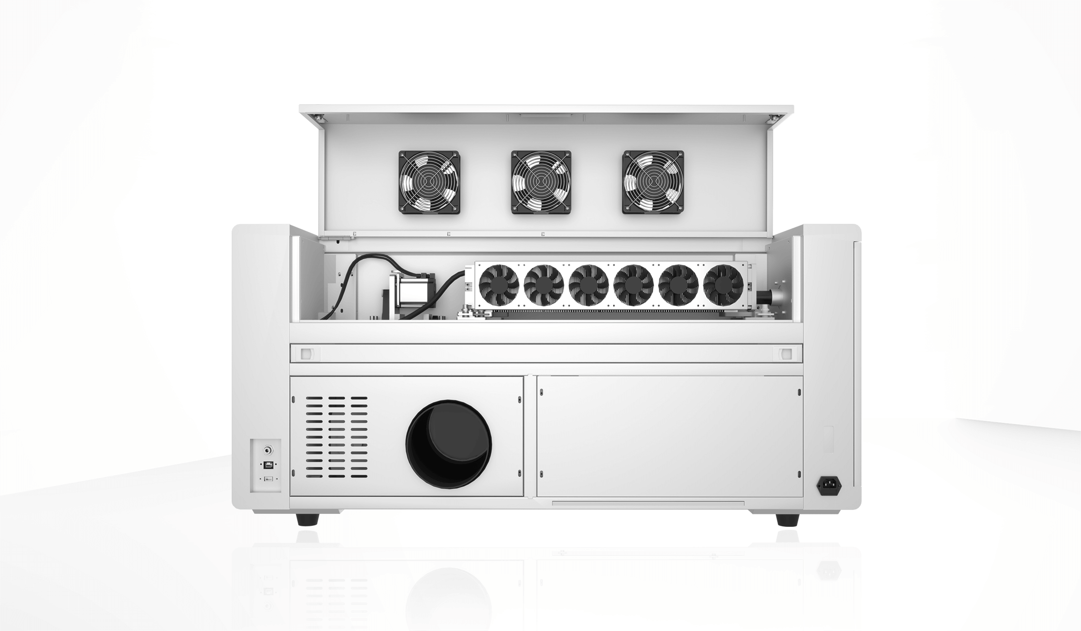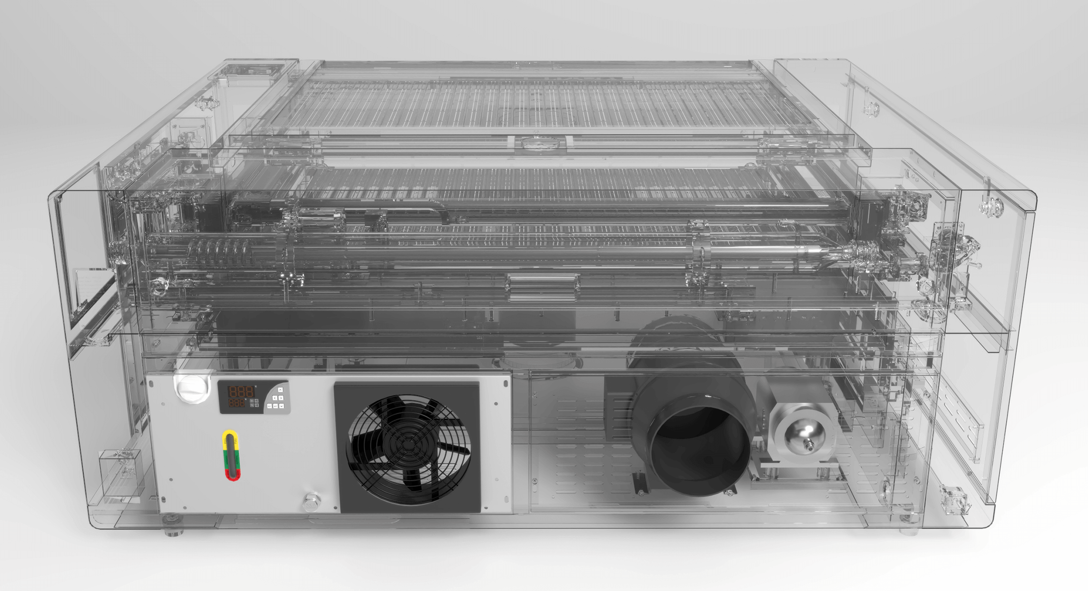 If space is of concern, you'll be pleased to know that Aeon is the first in the laser industry to offer an all-in-one solution comprised of an integrated water cooling system, exhaust fan and air assist pump so that no extra space is needed for ancillary components, minimizing the footprint of the machine and making your workspace neater and more organized.