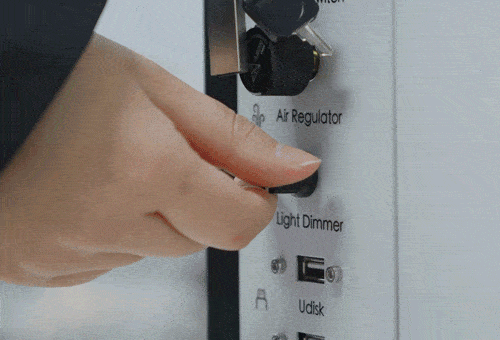The already well-lit work area just got brighter with the addition of 2 more LED lights on the underside of the MIRA lid, just behind the handle. When the lid is opened, the 2 interior LEDs turn off and the overhead lights turn on to illuminate your work area, while loading material and using the camera. There is even a dimmer knob on the side of the machine for setting the mood just right.