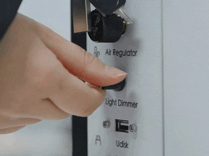 The already well-lit work area just got brighter with the addition of 2 more LED lights on the underside of the MIRA lid, just behind the handle. When the lid is opened, the 2 interior LEDs turn off and the overhead lights turn on to illuminate your work area, while loading material and using the camera. There is even a dimmer knob on the side of the machine for setting the mood just right.